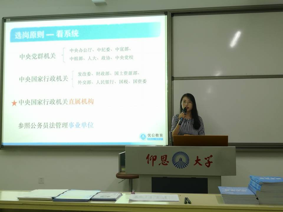 此次讲座由宋慧敏老师主讲,期间,宋慧敏老师从国考考情数据剖析、岗位应该如何筛选、选岗四项基本原则、行测申论备考建议四个部分给大家具体分析了国考岗位如何填报,使同学们对国考岗位有了进一步的了解。在场的同学们认真聆听并记录讲座内容,积极与讲师互动。最后,讲师还结合自身多年经验及体会给在场同学提出备考建议并推荐了一些网站和备考资料建议同学们在复习中要多关注国家政策走向,关注时事新闻,把握时代脉搏,同学们在本次讲座中受益良多。至此,公务员岗位填报讲座落下帷幕。
