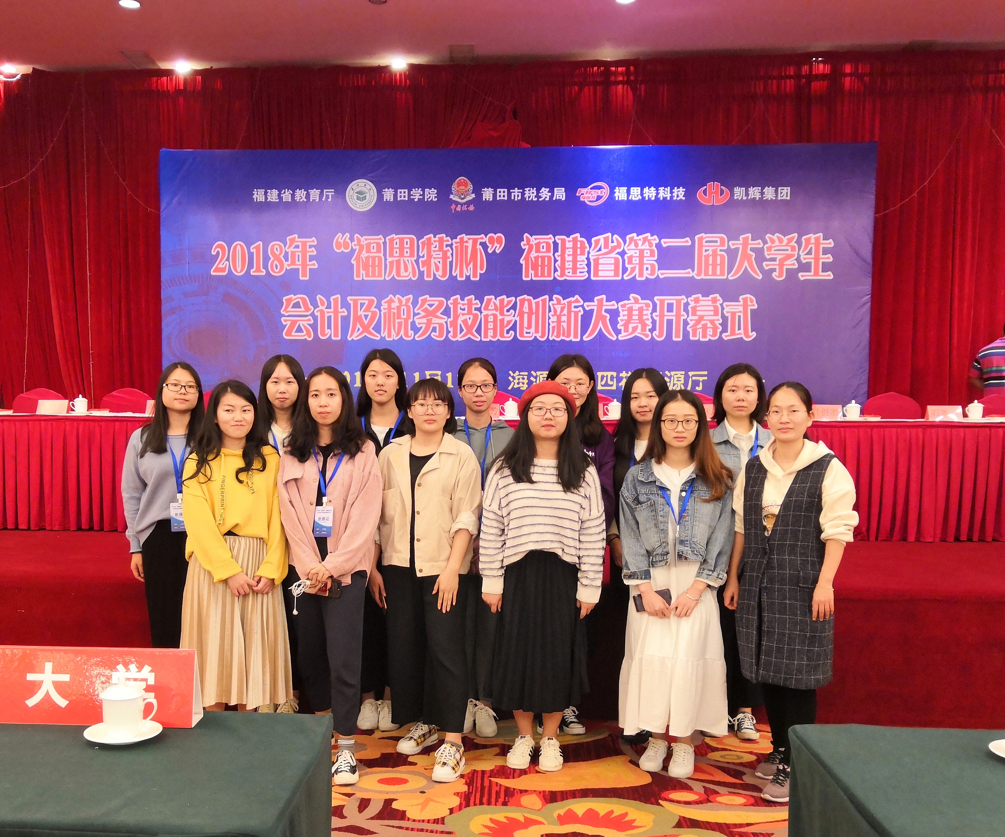 2018年“福思特杯” 第二届福建省大学生会计及税务技能大赛是由福建省教育厅主办、莆田学院与莆田市税务局联合承办。 本次比赛共吸引来自福州大学、华侨大学、福建农林大学、永利集团等41所院校近500名参赛选手及指导教师前往参加比赛。我校共有12名学生在林秋花老师的带领下赴赛。