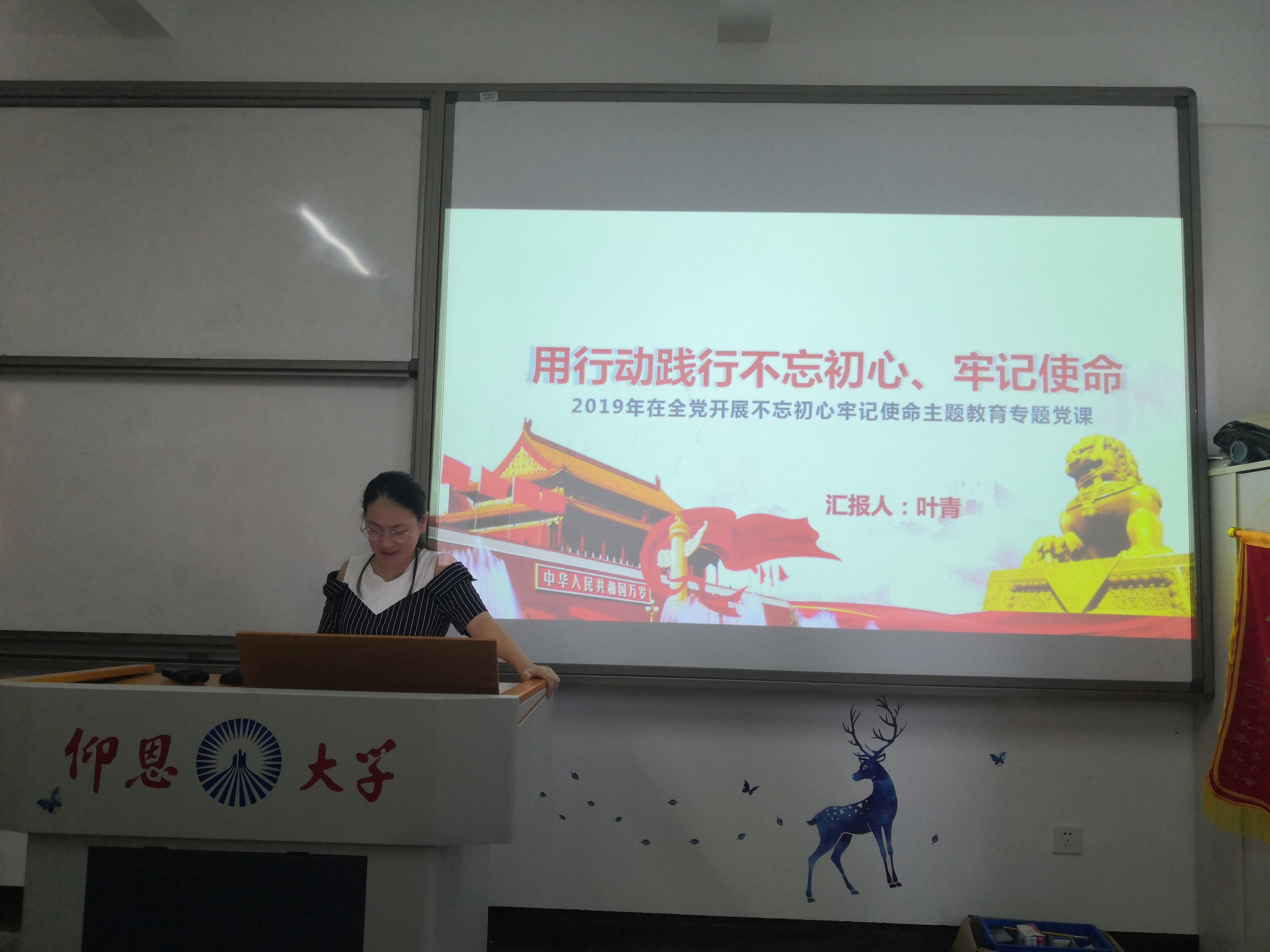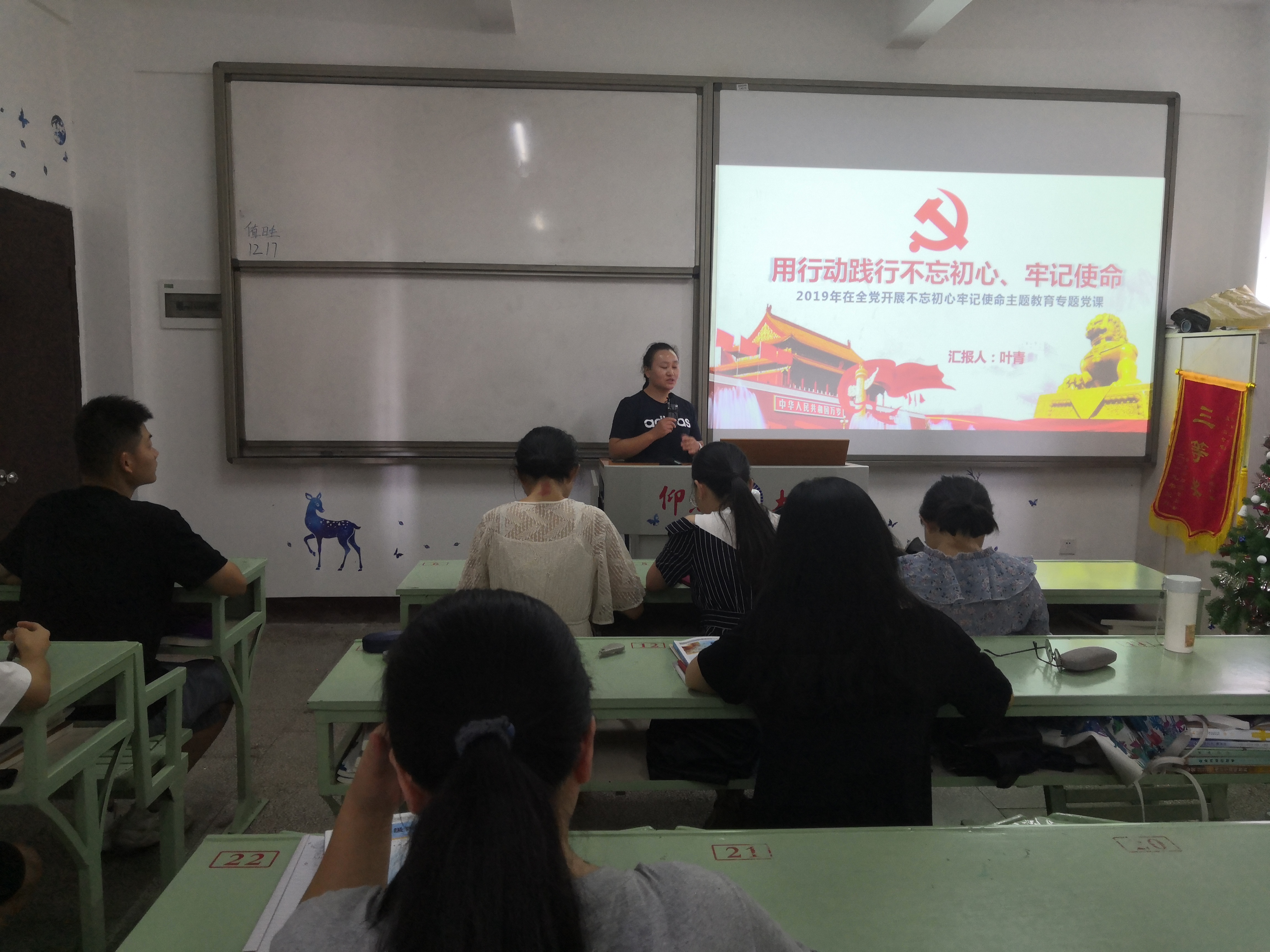 此次会议由教师党支部书记叶青主持并进行了 “践行初心使命”的专题学习研讨,她主要从三个方面进行讲解,第一,明确“不忘初心、牢记使命”,它是共产党人的新时代宣示,是凝聚奋进新时代的磅礴力量;第二,深刻领会“不忘初心、牢记使命”时代价值,从历史和现实看、从党的性质和宗旨看,我们需要“不忘初心、牢记使命”;第三,确保主题教育取得成效,要准确把握主题教育的总要求,即要在牢记根本宗旨中坚守初心,要在攻坚克难进程中担起使命,要准确把握主题教育的方法步骤,即要加强学习教育,深入调查研究,认真检视问题,抓好整改落实。