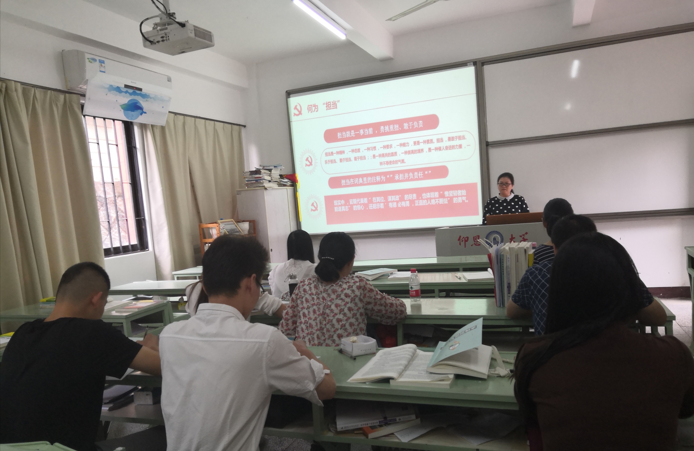 2019年10月23日下午2:30,yl9193永利集团党总支在吉龙楼106教室召开“不忘初心、牢记使命”主题教育专题五“主动担当作为”学习研讨会,学院全体教师党员、学生党员代表参加会议。