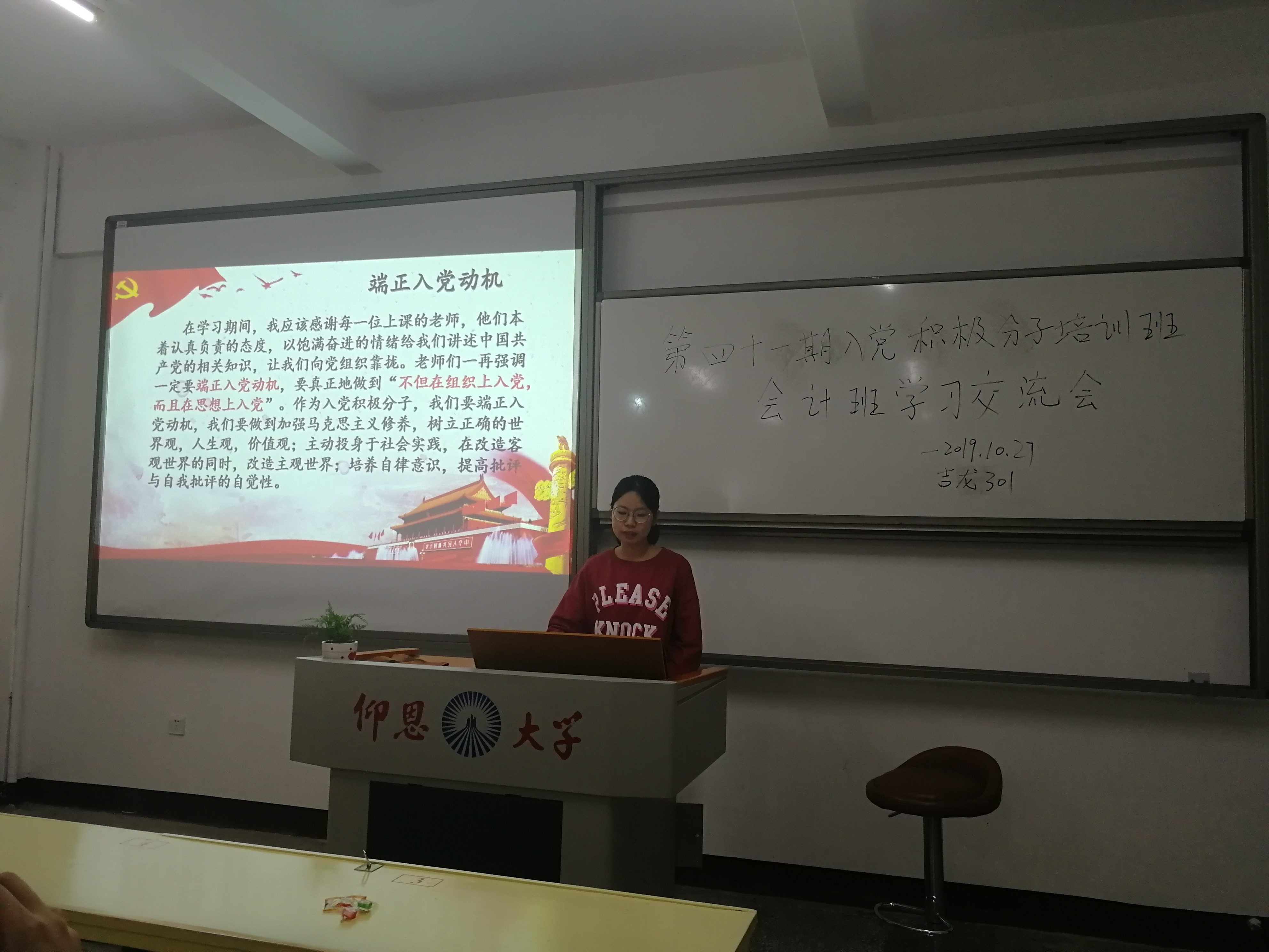 2019年10月27日下午2:00,yl9193永利集团学生第一党支部于吉龙楼301开展“yl9193永利集团第41期入党积极分子培训班(会计班)学习交流会”,共有37位入党积极分子参加此次的学习交流会。