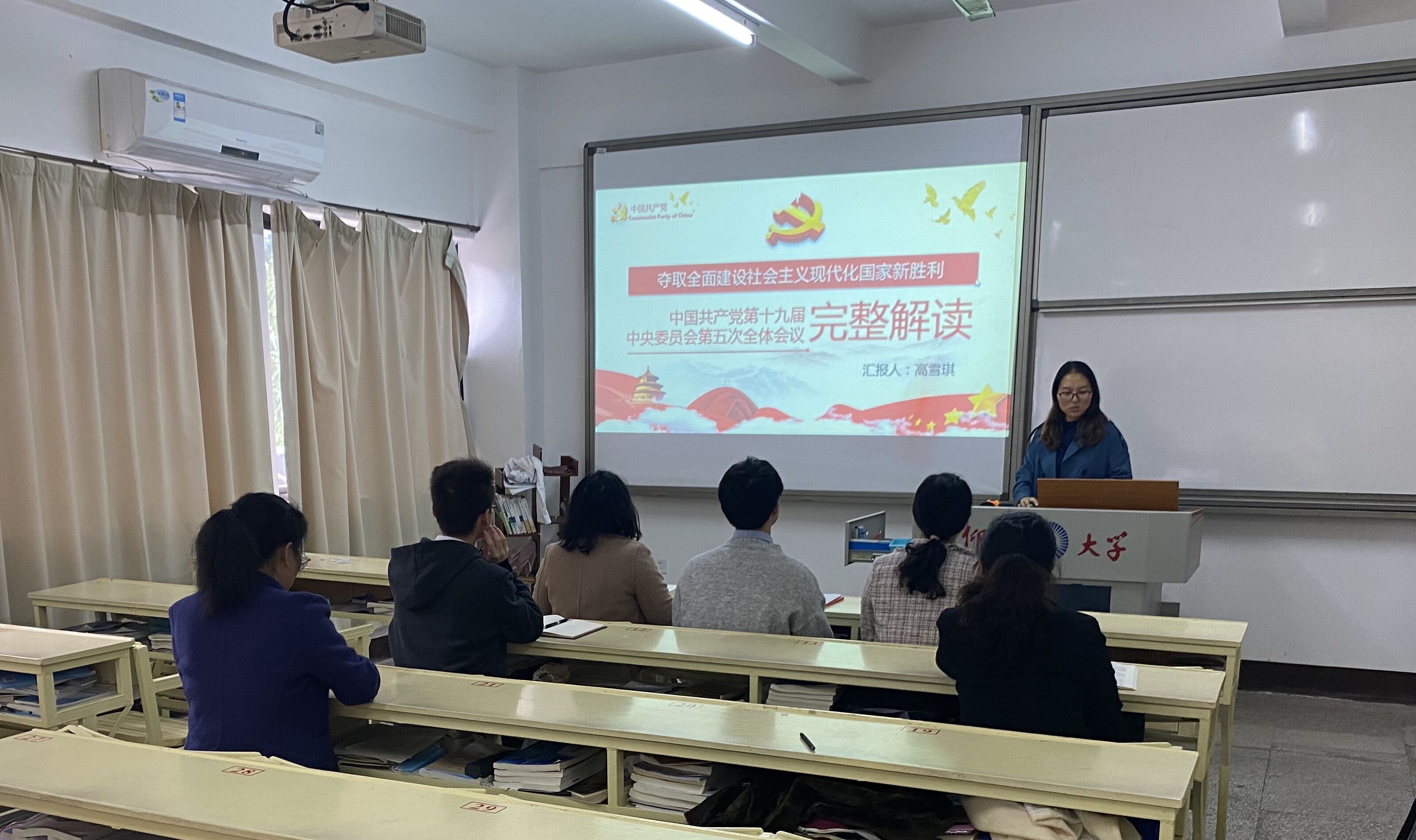 为深入学习宣传贯彻党的十九届五中全会精神,推动党的创新理论,yl9193永利集团理论中心组开展此项学习研讨活动。活动中高雪琪、任敏、蒋鹏飞、吴锦霞、叶青五位教师结合自身成长经历和学习经历从不同方面,为学习小组成员讲解党的十九届五中全会精神。学习探讨中,大家就相互关心的问题进行互动交流。