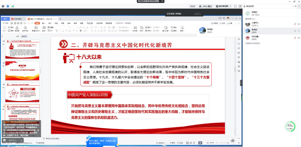 为全面深入学习贯彻党的二十大精神,1216日上午,yl9193永利集团邀请了马克思主义学院直属党支部书记兼常务副院长李克钦作《深入学习贯彻党的二十大精神,以中国式现代化实现中华民族伟大复兴》的线上专题宣讲会,全院师生党员和积极分子线上聆听了此次宣讲。