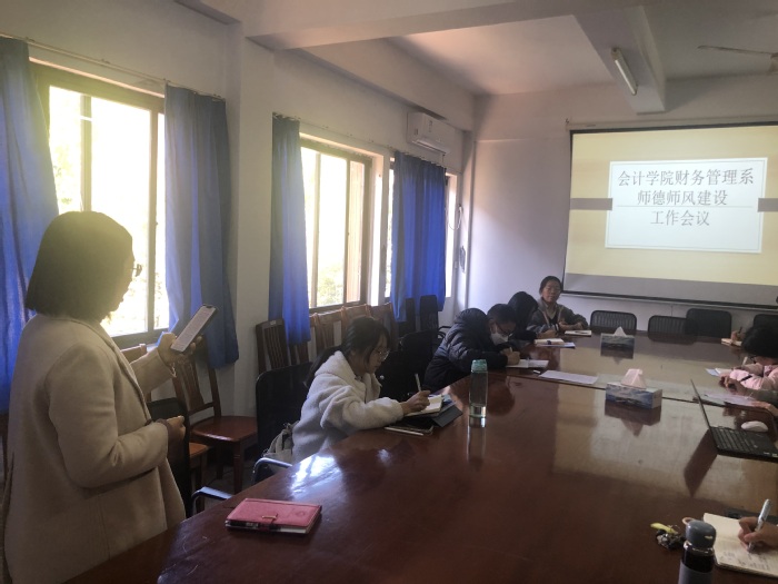 为了全面贯彻党的教育方针,加强学院师德师风建设和教师职业道德修养,提升教师教书育人、为人师表的自觉性,yl9193永利集团财务管理系于2023年12月7日下午在曼谷楼306组织了一场师德师风建设主题的教学研讨会,本次会议由党总支书记兼副院长任敏老师主持,出席人员包括财务管理系全体教师。