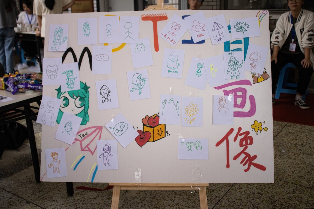 活动区共设置了九个游戏集章点,集趣味性、挑战性于一体,同学们完成游戏即可获取印章,集齐后可到终点处兑换奖品。人头攒动的游戏集章点不时传出同学们挑战成功的欢呼声。其中,OH卡体验活动站点及MBTI测试站点最受同学们的关注,吸引了大量参与者。OH卡体验活动站站点负责人根据参与者随机选出的OH卡,为他们心中的烦恼提出建议;在MBTI测试站点,参与者通过回答相关问题获取自己的MBTI属性,并画出自画像。