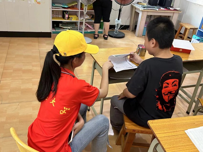 实践队员们教孩子们写字